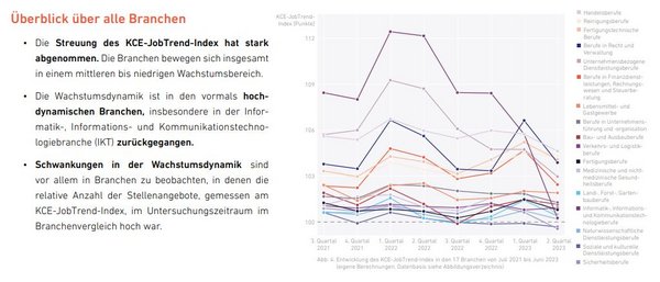 Allerdings hat die Wachstumsdynamik in der IKT-Branche zuletzt deutlich nachgelassen. Andere Branchen wie die Fertigungsberufe zeigen hingegen eine kontinuierliche Nachfrage nach Fachkräften, was den anhaltenden Fachkräftemangel widerspiegelt.